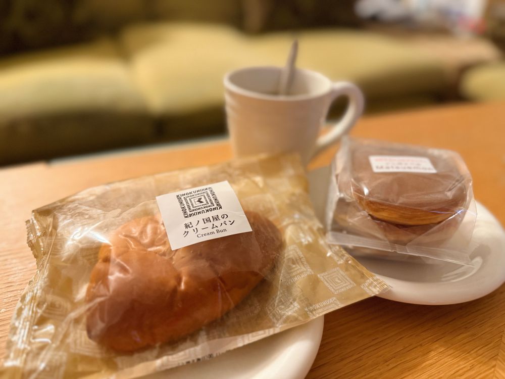 コーヒーを淹れて、「紀ノ国屋のクリームパン」と、思わず手に取った「どら焼きの皮」を、いただいてみました。
